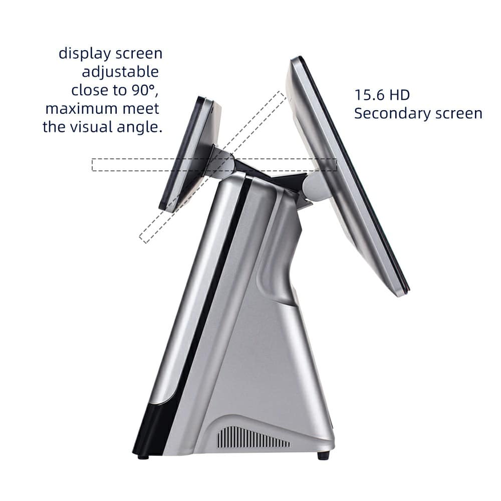 The 15.6 Inch Dual Screen POS System with Custom Customer Display is a flexible and modern point-of-sale solution designed to meet different business needs. It features a 15.6-inch main touch screen for operators and a customizable customer display that can be configured based on application requirements.