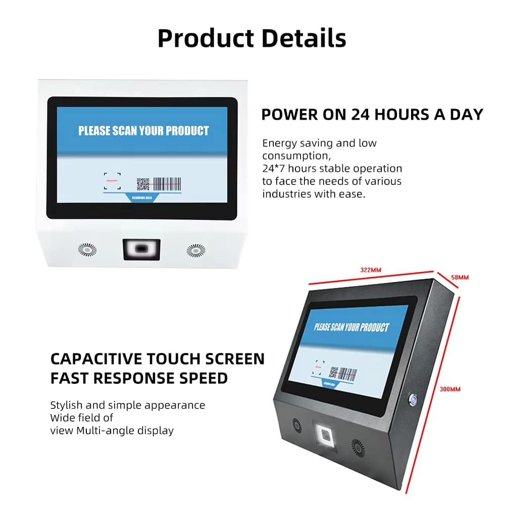 Our 11.6-inch touch screen self-service kiosk with POS integration offers an efficient and user-friendly solution for supermarkets, retail stores, and other businesses. Featuring a high-definition touch screen and integrated POS system, this kiosk streamlines customer service by enabling self-checkout, payments, and other services all in one device. Whether you are looking to reduce wait times or enhance customer experience, this self-service kiosk is an ideal addition to your retail setup.